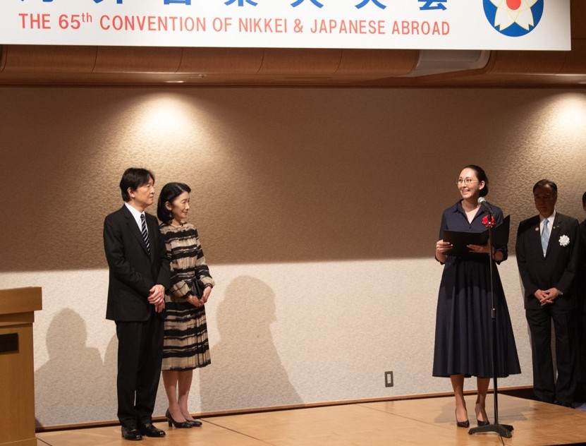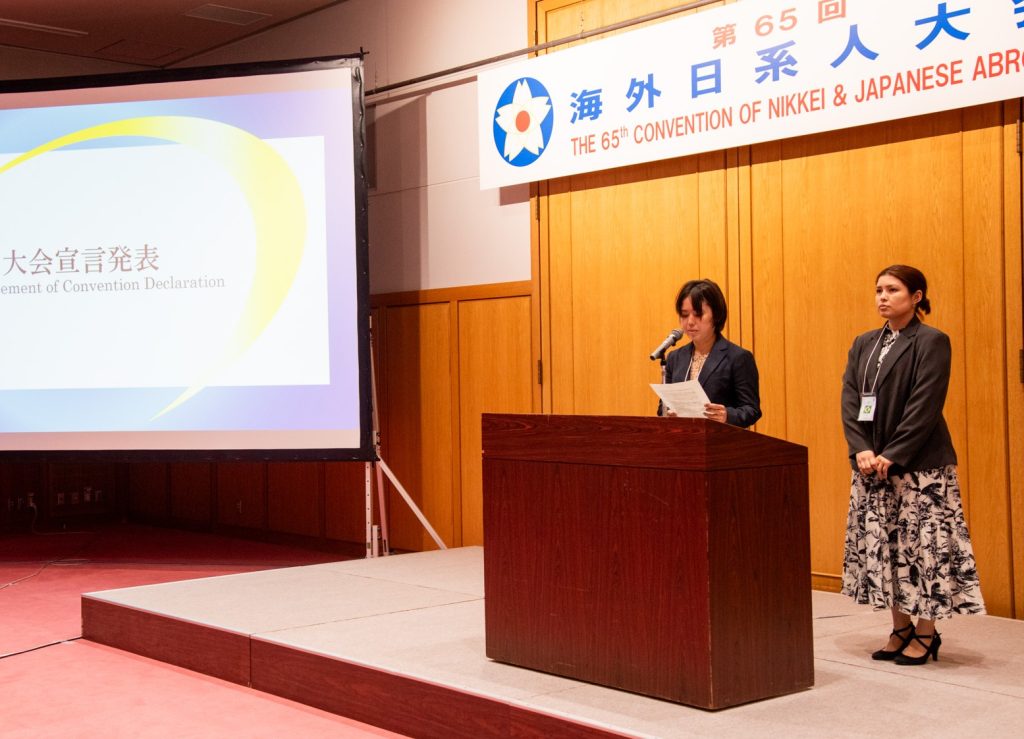 「日系人の主張(5分間スピーチ)」を行いました。アメリカ、カナダ、チリ、パラグアイ、ブラジル、ペルーから10名が登壇し、5分間という限られた時間の中でそれぞれの想いや、活動の紹介などを行いました。その後、「在日日系人スピーチ」では、現在日本の大学・大学院に就学中の日系人学生3名がスピーチを行いました。また、2日の国際シンポジウムにてとりまとめられた「大会宣言(案)」を、参加者を代表して、ボリビアの仁田原晃美氏・ブラジルのピネイロ江口ルシアナ宏子氏が発表し、「大会宣言」として改めて全参加者の承認を得ました。
